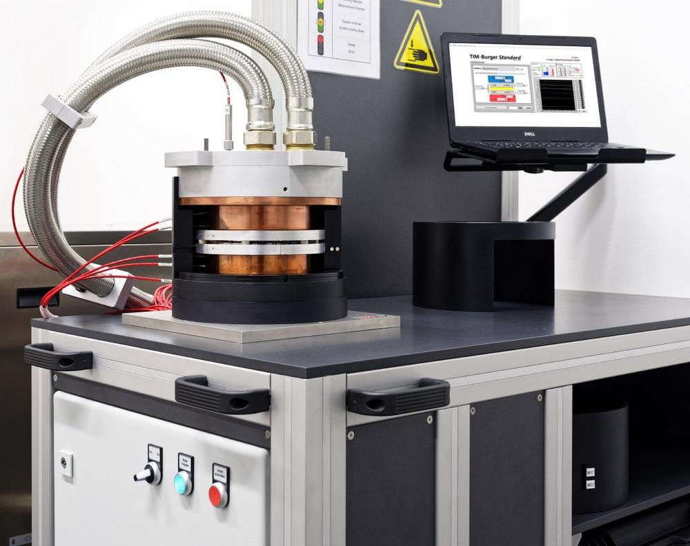 Initiiert durch industriellen Wunsch und in enger Kooperation mit dem Lehrstuhl für Wärme- und Stoffübertragung (WSA) der RWTH Aachen University, wurde hierzu durch das Ingenieur-Unternehmen en2Aix – energy engineering Aachen GmbH ein Messsystem für die Charakterisierung neuartiger Materialien entwickelt (siehe Abbildung 1). In Anlehnung an die durch die American Society for Testing and Materials (ASTM) veröffentlichte Norm ASTM-D5470 ermöglicht dieses Messsystem die Ermittlung des thermischen Widerstandes, beispielsweise von pastösen Gapfillern, sowie von inhomogenen und strukturierten Materialien unter realitätsnahen Bedingungen.