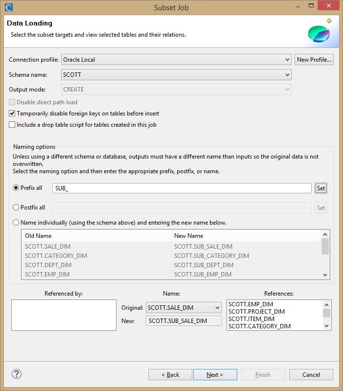 Der Assistent zur Erstellung von Teilmengen lässt den Benutzer die Quelle der Teilmenge, die Größe und Sortierung der Teilmenge, die Namen für die Teilmengenziele und die Verschlüsselung oder Maskierung, die die Teilmenge erhalten soll, auswählen. Der Assistent erstellt dann eine Reihe von Auftragsskripten, die entweder Subset-Tabellen oder Flat-Files erstellen.