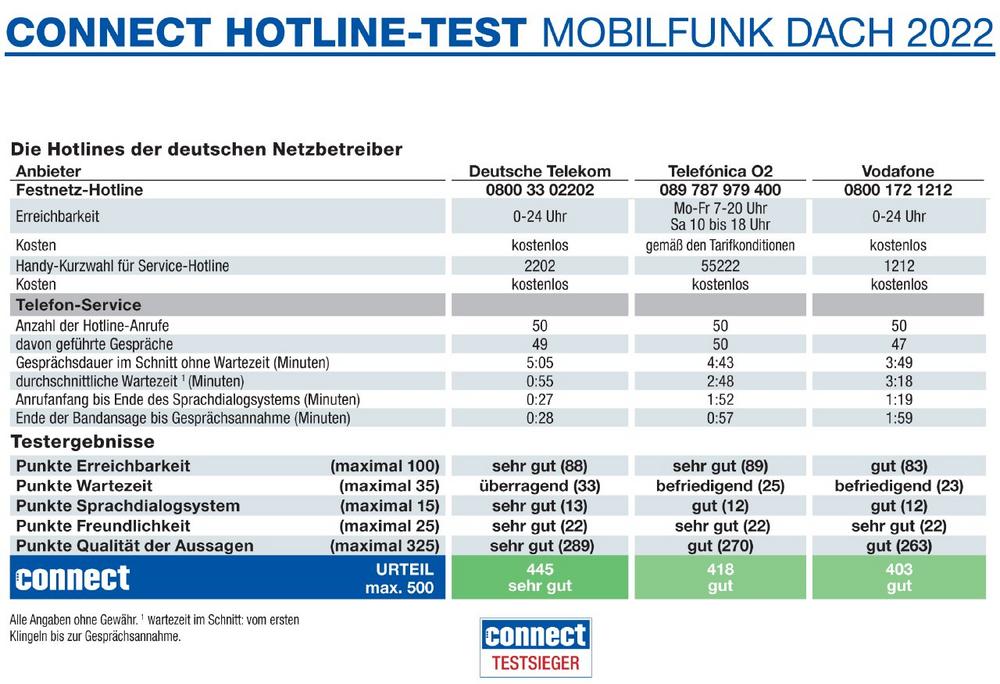 Die Deutsche Telekom liegt unangefochten an der Spitze und erzielt mit 445 von 500 Punkten und der Note „sehr gut“ den Gesamtsieg. Der Anbieter überzeugt mit einer hohen Kundenorientierung, professioneller und umfassender Beratung sowie sehr kurzen Wartezeiten. Mit 418 Punkten und dem connect-Urteil „gut“ folgt Telefónica O2 auf Platz zwei. Die Wartezeit und die Erreichbarkeit haben sich im Vergleich zum Vorjahr verbessert. Die Tarifberatung ist eine deutliche Stärke, die Qualität der Antworten ist insgesamt gut. Vodafone erreicht auf Platz drei 403 Punkte und damit ebenfalls das Urteil „gut“. Im Bereich Wartezeit erzielt der Anbieter einen Fortschritt, ebenso in der Qualität der Aussagen gegenüber Kunden. Bei der Erreichbarkeit der Hotline zeigt der Test Verbesserungspotenziale auf.