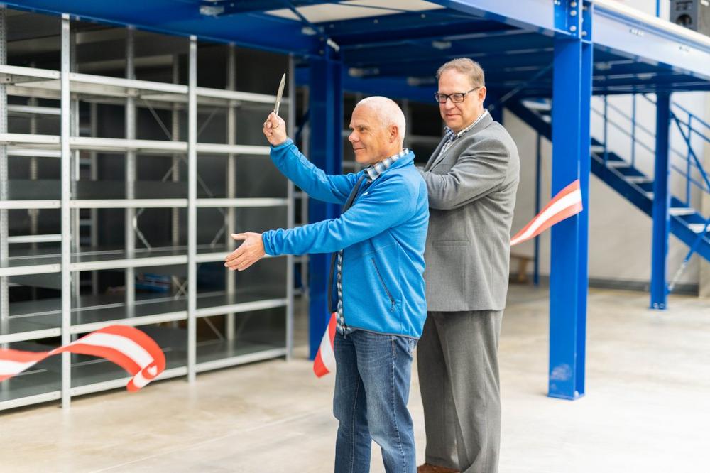 Gemeinsam mit dem ersten Bürgermeister der Stadt Wolframs-Eschenbach zerschnitt Geschäftsführer Herrmann Messerer symbolisch das Band zur neuen Lagerhalle. Umrahmt von Musik wurde der Festakt in lockerer Atmosphäre eingeleitet, bevor die Geschäftsleitung und der Bürgermeister das Wort an die Anwesenden richteten. Der besondere Dank in deren eröffnenden Worten ging an die Partner des Bauvorhabens vor Ort, sowie an die Stadt, die das Bauvorhaben jederzeit kompetent unterstützt hat.