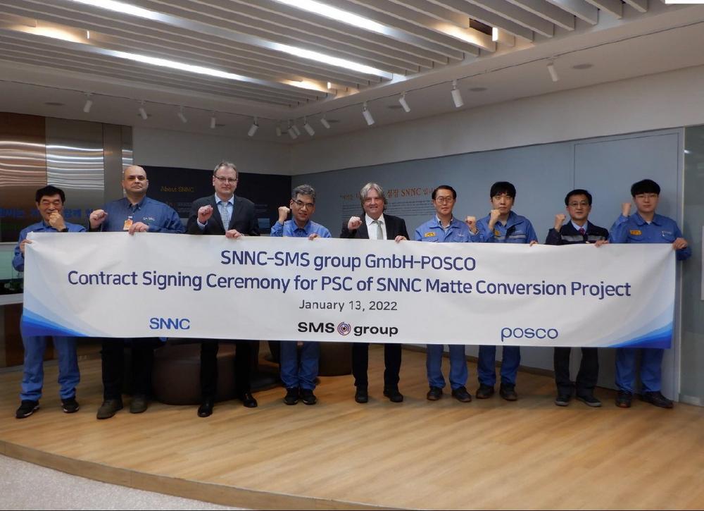 SMS group hat von SNNC- ein Joint Venture zwischen SMSP und POSCO in Südkorea einen Auftrag zur Lieferung eines Peirce-Smith-Konverters (PSC) erhalten, in dem das Ferronickel aus dem Werk Gwangyang in Nickelmatte (eine Nickel-Sulfit-Phase) umgewandelt wird, um den Eisengehalt zu senken. Die Nickelmatte wird dann in der benachbarten Batteriefabrik von POSCO hydrometallurgisch zu Nickel und Nickelsulfat verarbeitet. Der von SMS zu liefernde Peirce-Smith-Konverter ist eine der Schlüsseleinheiten in dieser gesamten Prozesskette und wandelt das Ferronickel mithilfe spezieller Unterbaddüsen und eines Flüssigschwefel-Einspritzsystems effizient in hochwertige Nickelmatte um.