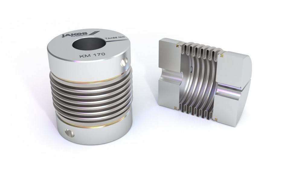 It has proven itself on the market for decades and is a reliable and inexpensive standard series among metal bellows couplings: The KM metal bellows coupling from JAKOB Antriebstechnik. Like all metal bellows couplings, it is stiff in the direction of rotation, but flexible in the axial, angular and radial directions. Despite the similarities, metal bellows couplings sometimes differ greatly from one another. The technical differences lie, for example, in the choice of bellows or the type of connection between bellows and hub or bellows and shaft. JAKOB only uses thin-walled, multi-layer bellows made from certified stainless steel sheets. This causes a high torsional stiffness. This ensures a high level of positioning and concentricity even under difficult conditions, which guarantees absolutely backlash-free torque transmission between the input and output shaft. The multi-layer bellows design also enables large shaft displacements to be absorbed while the restoring forces are still small. That means a plus in reliability, operational safety and service life.