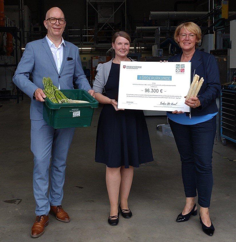 Bei der Übergabe im Institut für Biokunststoffe und Bioverbundwerkstoffe (IfBB) an der Hochschule Hannover (HsH) sagte Ministerin Otte-Kinast: „Spargelschalen werden für Holz-Kunststoff-Verbundwerkstoffe nutzbar gemacht. Im Frühsommer kann man dann auf der Terrasse sitzen – den Spargel auf dem Teller genießen, während sich die Spargelschalen beispielsweise in den Terrassendielen oder anderen Bodenbelägen wiederfinden. Das ist nachhaltige Verwertung von Rohstoffen!“