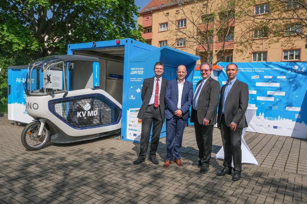 Im Rahmen des von der EU (EFRE) und dem Land Sachsen-Anhalt geförderten Projektes „Paket-KV-MD2“ hat die Mediengruppe Magdeburg, unterstützt durch die FIApro UG sowie wissenschaftlich begleitet durch den Lehrstuhl Logistik der Otto-von-Guericke-Universität Magdeburg, ein neues Konzept für die Paketzustellung auf der „Letzten Meile“ entwickelt, das nun prototypisch mit dem Mikro-Depot in Stadtfeld Ost in der Praxis getestet wird. Das Besondere: es handelt sich um eine nachhaltige, gebündelte und flexible Paketzustellung, die auf einem Mikro-Depot, stationären und mobilen Paketstationen, vier Paket-Raketen von ONO sowie Swobbee Akku-Lade- und Wechselstationen basiert. Im Mikro-Depot werden die von den verschiedenen KEP-Dienstleistern gelieferten Sendungen von der Mediengruppe vorsortiert und dann gebündelt von den Paket-Raketen an die Paketstationen oder Empfänger:innen ausgeliefert. Die Kunden erhalten somit nur eine gebündelte Zustellung, statt auf mehrere einzelne von verschiedenen KEP-Dienstleistern zu warten.