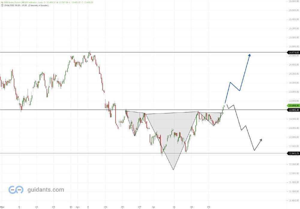 Charttechnisch fällt die im Daily-Chart heute vollendete umgekehrte Schulter-Kopf-Schulter-Formation auf. Die Formation bildet sich aus den leichten Abverkäufen am 23.06. und 26.07. sowie dem dazwischenliegenden stärkeren Abverkauf am 05.07. Das bullishe Muster könnte auf weitere Kursanstiege hinweisen. Für den aktuell bei 13441 Punkten notierten Index sehe ich kurzfristig einen Anstieg bis auf 13750 für sehr wahrscheinlich an. Dort habe ich nach meiner Chartanalyse die nächste Widerstandsebene lokalisiert. Sollte diese überwunden werden, könnten Anstiege über die Abwärtstrendlinie folgen. Bei einem weiteren Kursverfall dagegen sehe ich die nächste Unterstützung bei 12500 Punkten.