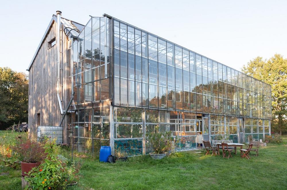 1969 wurde De Hobbitstee als Hippie-Kommune in den Niederlanden gegründet und hat im Laufe der Jahre viele Veränderungen durchgemacht. Obwohl das Leben heute hier ganz anders ist als vor rund 50 Jahren, hat das Kollektiv immer noch Ideale und Träume. So wurde das Streben nach einem nachhaltigen und autarken Lebensstil auch bei einem aktuellen Hausbau-Projekt umgesetzt. Entstanden ist ein Gebäude, das gestalterisch eine Holzscheune mit einem Gewächshaus kombiniert.