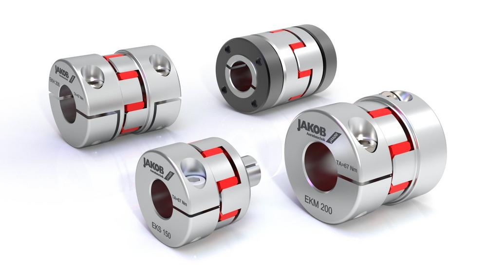 Elastomerkupplungen sind steckbare, spielfreie und flexible Wellenkupplungen für alle kleinen und mittleren Drehmomente bis 2000 Nm. Das Verbindungs- und Ausgleichselement ist ein Kunststoffstern mit evolventenförmigen Zähnen und hoher Shore-Härte. Dieser wird formschlüssig, mit leichter Vorspannung in zwei hochpräzise gefertigte Naben mit klauenförmigen Nocken eingesetzt. Der elastische Kupplungsstern kann geringfügige Wellenversätze ausgleichen, ist elektrisch isolierend und weist ein gutes Schwingungsdämpfungsverhalten auf. Es stehen mehrere Standardvarianten mit spielfreier, kraftschlüssiger Welle-Nabe-Verbindung zur Auswahl, welche auch ohne zusätzliche Passfeder eine sichere Drehmomentübertragung gewährleisten. Die Serien EKM, ESM-A, EKH und EKS mit Spreizkonus sind im Standardprogramm erhältlich, auf Anfrage sind auch individuelle Lösungen möglich.