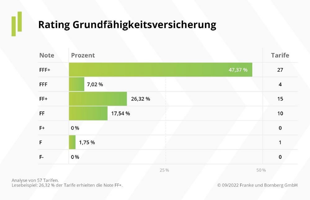 Das neue GF-Rating untersucht 97 Tarife von 26 Gesellschaften nach bis zu 74 Kriterien (Stand September 2022). Franke und Bornberg unterscheidet dabei zwischen „Grundfähigkeit“ und „Grundfähigkeit Plus“. Tarife der Plus-Variante bieten Zusatzbausteine mit weiteren Leistungsauslösern. Dazu zählt zum Beispiel Versicherungsschutz bei schweren Krankheiten. Die Höchstnote FFF+ erhalten nur Tarife, die alle 15 Grundfähigkeiten in der geforderten Qualität absichern.