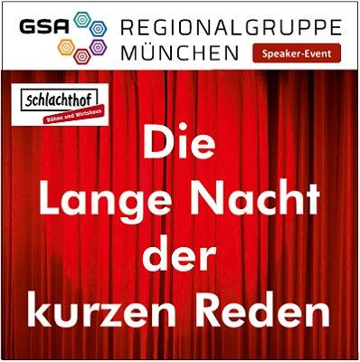 Seit 2016 ist die "Lange Nacht der kurzen Reden" der GSA Regionalgruppe München (Berufsverband der Redner), bei der immer am 11.11. eines Jahres 11 Redner in max. 11 Minuten 11 Themen präsentieren können, ein großer Erfolg. Jede Veranstaltung der letzten Jahre war im Vorfeld ausverkauft und das Publikum war von den 11 x 11 Minuten der RednerInnen begeistert. Wie auch im Jahr 2021 wird das originelle Speaker-Event wieder im urig bayerischen Wirtshaus "Im Schlachthof" stattfinden.