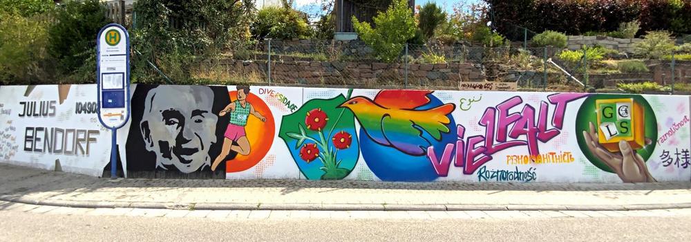 Am Anfang der Komposition ist Bendorf als älterer Mann und, etwas kleiner, als junger Sportler abgebildet. Weil ihn mit den Schülern etwas Wichtiges verbindet, nämlich der Heimatort Ober-Ramstadt, prangt nun das Wappen der Stadt groß auf der Mauer. Gehalten wird es von einer Friedenstaube, deren Flügel in den Regenbogenfarben, dem Symbol für Vielfalt, aber auch für Ober-Ramstadt („Stadt der Farben“), schillern. Das Wort Vielfalt ist auf ukrainisch, portugiesisch, japanisch, polnisch und farsi aufgepinselt und weist auf die internationale Zusammensetzung der Klassen in der Georg-Christoph-Lichtenberg-Schule hin. Mit dem Bild des Stolpersteins für Bendorf und den Initialen der Schule endet der Zeitstrahl. Es ist ein Hinweis darauf, dass heute zum Glück andere Werte gelten als während der Nazi-Zeit.