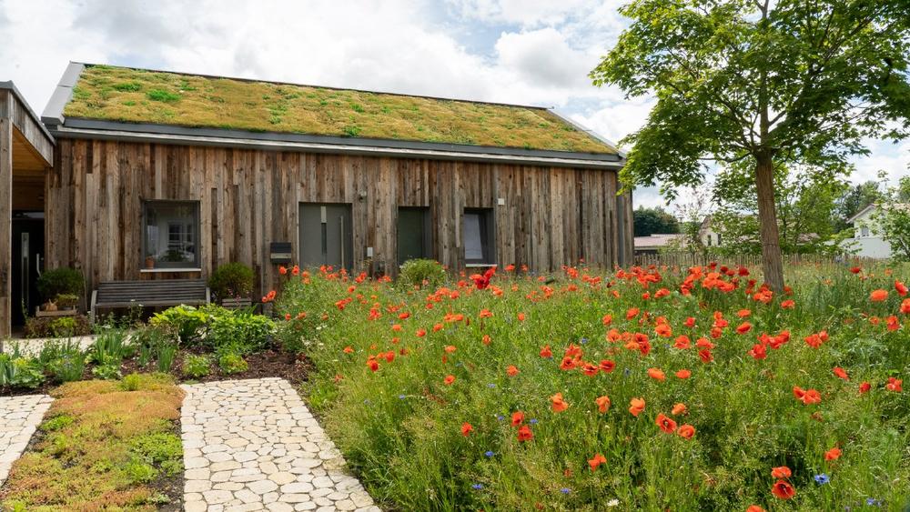 Mittlerweile sind die anfangs eher kritischen Stimmen im Dorf bezüglich eines Gründaches verstummt und die Neugier sowie Begeisterung der Anwohner wächst. Das Objekt liegt direkt an der Dorfstraße und führte schon zu einigen spontanen Anfragen von Durchreisenden, da sich Gründach und verwitterte Holzfassade zu einem außergewöhnlich harmonischen Gesamtbild ergänzen und auffallen. Der naturnah gestaltete Garten mit Staudenmischpflanzung, Teich sowie kaum versiegelten Terrassenflächen spiegelt das ganzheitliche Grünkonzept und ist ein wunderschönes Beispiel gelebter Klimaresilienz, und zwar von Kopf bis Fuß, beziehungsweise vom Dach bis zum Boden.