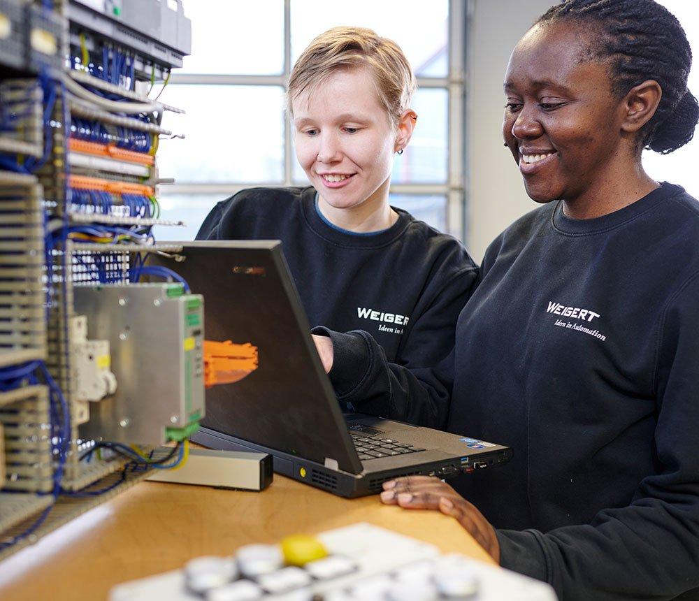 Die Auszubildenden Amelie und Teresa sind seit zwei Jahren im Unternehmen. Und beide absolut zufrieden mit ihrer Entscheidung, den Ausbildungsvertrag bei Weigert unterschrieben zu haben. „Unsere Aufgaben sind sehr vielseitig. Wir lernen, wie wir Schaltanlagen installieren, warten und reparieren. Das reicht vom Bau der Gerüste über den Einbau der Komponenten in die Schaltschränke bis zum Verdrahten nach Plan. Auch in der Planung und Programmierung dürfen wir unterstützen und sind vor Ort, wenn die Schränke in Betrieb genommen werden“