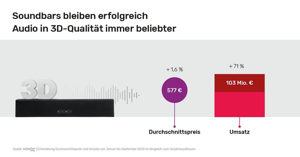 In den Monaten Januar bis September 2022 wurden in Deutschland insgesamt mehr als 600.000 Soundbars verkauft und ein Umsatzvolumen von mehr als 190 Millionen Euro generiert. Der Umsatz mit 3D-Klang-fähigen Geräte stieg in diesem Zeitraum um 71 Prozent auf knapp 103 Millionen Euro. Für die Produktgruppe Soundbars zeigt sich aufgrund des gestiegenen Durchschnittspreises auf 317 Euro (+ 9 Prozent) so insgesamt ein Umsatzwachstum um ein Prozent bei einem Stückzahlrückgang um sieben Prozent. Der Durchschnittspreis der 3D-Klang-fähigen Soundbars lag bei 577 Euro (+1,6 Prozent).