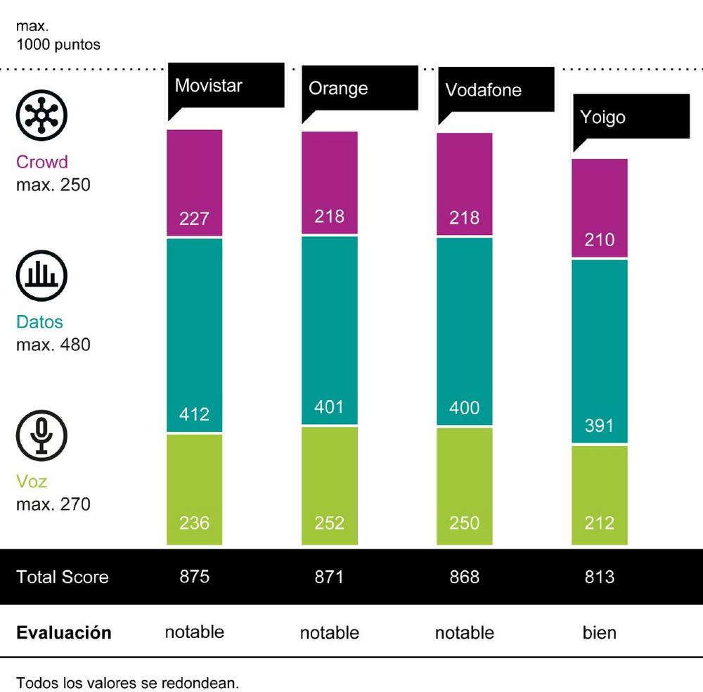 Orange logra una puntuación de 871 puntos, solo cuatro puntos por debajo de la ganadora, y también con una nota global de «muy bien». La operadora encabeza la categoría Servicios de voz y fiabilidad.