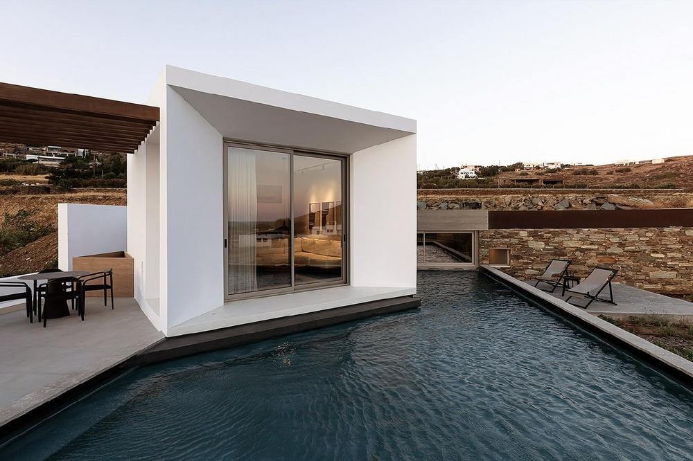Aristides and his studio, Aristides Dallas Architects (ADA), designed the property, inside and out, with earth, wind, and water as the guiding principles. Earth provided the inspiration for the master bedrooms, which are located on the lower levels of the villas: carved from stone, the rooms feature darker earth tones, establishing a cocooning cave-like ambiance, with specially designed lighting and 3D-printed sculptures designed by Aristides and his team. Wind is reflected in the light and airy, white-washed cubic shapes of the villas, which appear to float on water. And water itself surrounds all spaces, with the villas’ private pools aligning along the horizon with the Aegean Sea beyond.