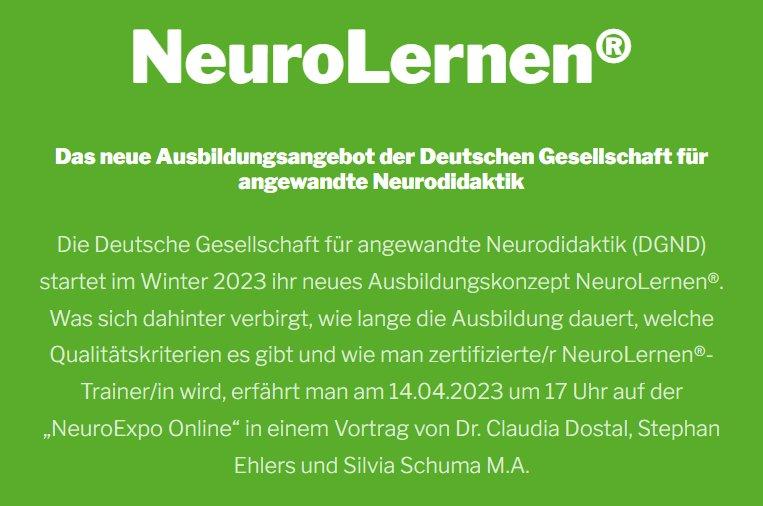 Die Deutsche Gesellschaft für angewandte Neurodidaktik e.V. – DGND startet im Winter 2023 ihr neues Ausbildungskonzept NeuroLernen®. Was sich dahinter verbirgt, wie lange die Ausbildung dauert, welche Qualitätskriterien es gibt und wie man zertifizierte/r NeuroLernen®-Trainer/in werden kann, erfährt man am 14.04.2023 um 17 Uhr auf der NeuroExpo Online.