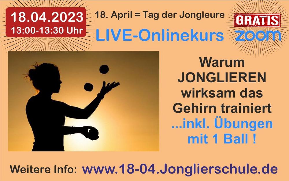 Warum Jonglieren wirksam das Gehirn trainiert … inkl. Übungen mit 1 BallStephan Ehlers wird in diesen 30 Minuten zeigen und erklären, wie, wo und warum Jonglieren im Gehirn wirksam ist. Die Teilnahme an diesem LIVE-Onlinekurs ist kostenfrei. Weitere Info + Anmeldung