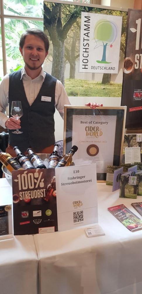 Die weltweit größte Apfelweinmesse findet am Samstag, den 29. April 2023 im Frankfurter Palmengarten statt. Als Beitrag zum europaweiten ‚Tag der Streuobstwiese‘ sind die Geschäftsstelle von Hochstamm Deutschland e.V. und die Mitglieder Jung Fruchtsäfte GbR, Echt Brombachseer e. G., Haldenhof Mosterei Zeller, Natur und Mohr, Purzelbaum, Nordappel GmbH, Stahringer Streuobstmosterei, Böhm Ciderwerkstatt GbR, Regionalinitiative hesselberger und Streuobst Mittelfranken-West eG. auf der CiderWorld vertreten. Für den zentralen Gemeinschaftsstand reisen diesjährig auch die befreundete ARGE Streuobst und die Mostbarone aus Österreich an. Die Produzenten vom Bodensee bis an die Nordsee und zurück in die Steiermark zeigen, was 100 %-Streuobstprodukte bieten: Ganz viel Genuss und noch mehr Biodiversität! Denn der Ehrengast ist dieses Jahr ‚Die Streuobstwiese‘. Ziel ist, dass mehr Menschen mehr Produkte aus 100 % Streuobst genießen und kaufen – und so die Streuobstwiesen erhalten! Denn nur, wenn sich die zeit- und arbeitsintensive Pflege der Wiesen und die Herstellung der edlen Produkte lohnen, führen Streuobstbewirtschafter ihre wertvolle Arbeit auch in Zukunft weiter.