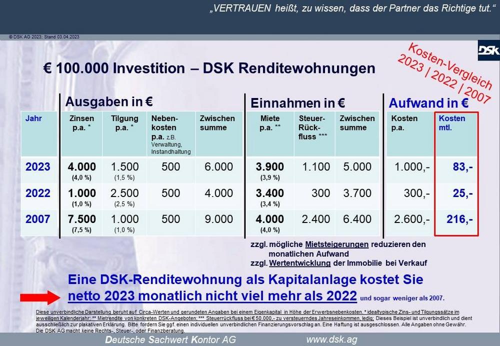 Die Finanzierung einer DSK-Renditewohnung kostet heute, selbst bei 4 % Darlehenszins + 1,5 % Tilgung heute monatlich NETTO kaum mehr als im Jahr 2022 bei 1 % Darlehenszins + 2,5 % Tilgung.