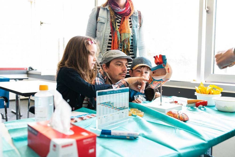 Den ganzen Tag konnten die 3D-Modelle menschlicher Herzen und echte Schweineherzen mit der Firma Corlife intensiv erforscht und untersucht werden. Sogar kleine Operationen konnten die Kinder unter Anleitung durchführen. Gegenüber durften die Herzklappen und Herzkatheter der Firma Medtronic nicht nur angeschaut, sondern auch angefasst werden. Das war für Kinder und Erwachsene, die sich getraut haben, sehr interessant.