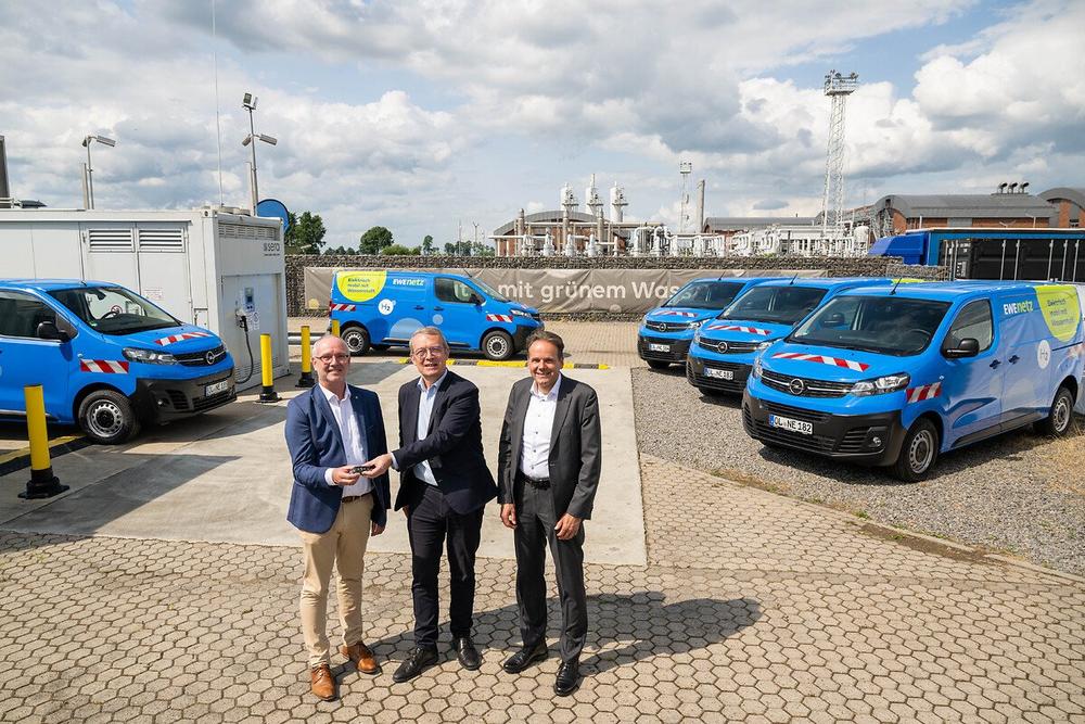 Jetzt hat Jean-Michel Billig, Chief Technology Officer für die Entwicklung von Wasserstoff-Brennstoffzellen-Fahrzeugen bei Stellantis, die Opel-Transporter auf dem EWE-Gasspeichergeländer in Huntorf bei Oldenburg übergeben. EWE-Technikvorstand Dr. Urban Keussen und EWE NETZ-Geschäftsführer Torsten Maus stellten die Fahrzeuge in Dienst.