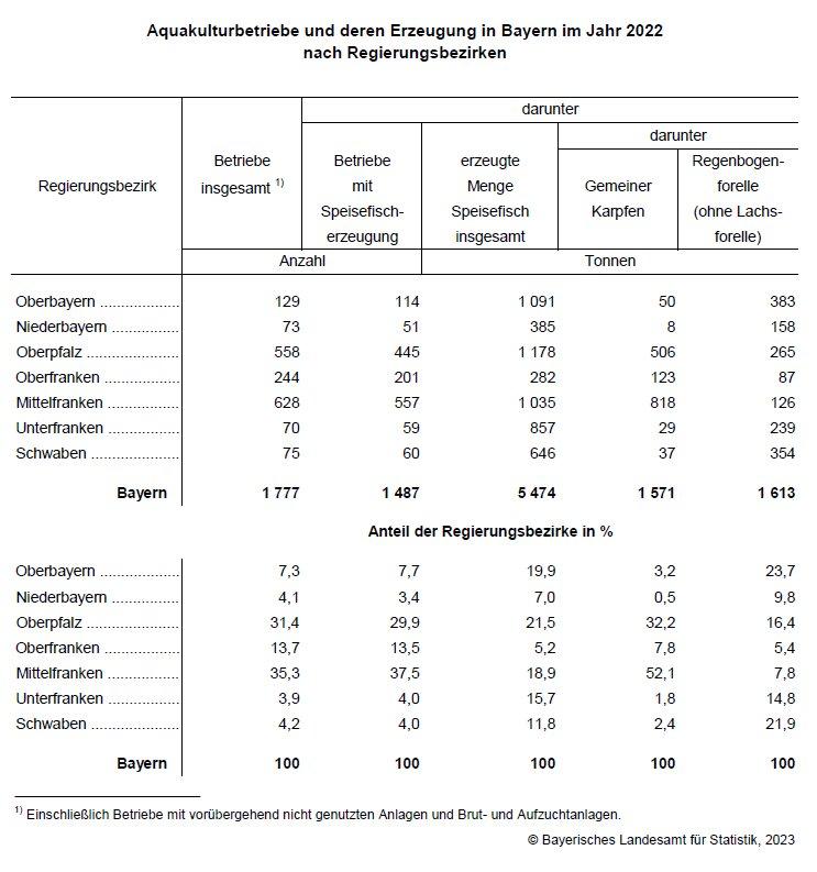 Beim Karpfen stammt mehr als die Hälfte der in Bayern erzeugten Menge aus Mittelfranken (52,1 Prozent bzw. 818 t). Regenbogenforellen kommen am häufigsten aus Oberbayern (23,7 Prozent bzw. 383 t).