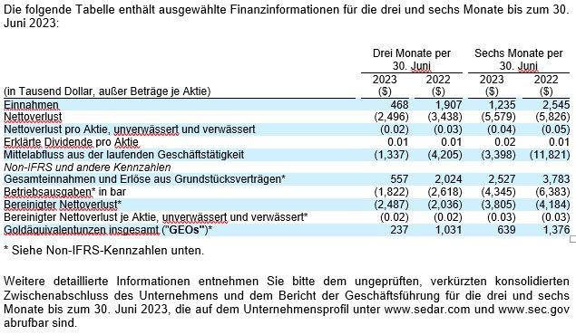 Das Unternehmen hat in dieses Dokument bestimmte Leistungskennzahlen aufgenommen, darunter: (i) bereinigter Nettoverlust und bereinigter Nettoverlust pro Aktie; (ii) GEOs; (iii) Gesamteinnahmen und Erlöse aus Grundstücksverträgen; und (iv) Cash-Betriebskosten, die jeweils keine IFRS-Kennzahlen sind. Die Darstellung solcher Non-IFRS-Kennzahlen soll zusätzliche Informationen liefern und sollte nicht isoliert oder als Ersatz für nach IFRS erstellte Leistungskennzahlen betrachtet werden. Diese Non-IFRS-Kennzahlen haben keine standardisierte, von den IFRS vorgeschriebene Bedeutung, und andere Unternehmen können diese Kennzahlen anders berechnen.