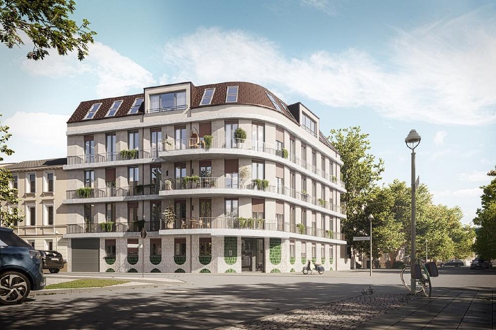Stadtheide schließt die letzte Baulücke und gliedert sich mit der sanft geschwungenen Fassade perfekt in den klassisch gewachsenen Altbau-Kiez ein. Die bodentiefen Fenster werden von schlanken Gesimsbändern unterbrochen, die dem ruhigen Fassadenbild eine gekonnte Dynamik verleihen. Die bis in ihre Einzelheiten durchdachte Architektur stammt aus dem Büro Frank Schiffer. So verleiht der Sockel aus Klinkerriemchen, ergänzt durch runde Fassadendetails mit farblichen Akzenten, dem Gebäude das gewisse Extra.