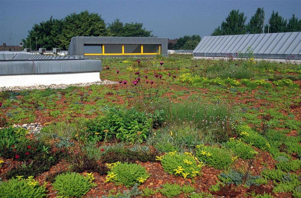 Der Systemaufbau „Sponge City Roof“ führt zu artenreicheren Begrünungen, wirkt dank hoher Verdunstung günstig auf das Kleinklima und dient dem Hochwasserschutz.