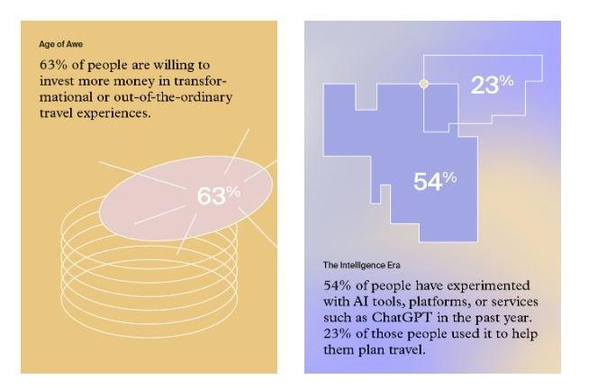 ‒ In the past year, 54% of people have experimented with AI tools, platforms, or services, such as ChatGPT, GPT-4, and DALL-E 2, and 23% of those people used AI to help them plan travel.