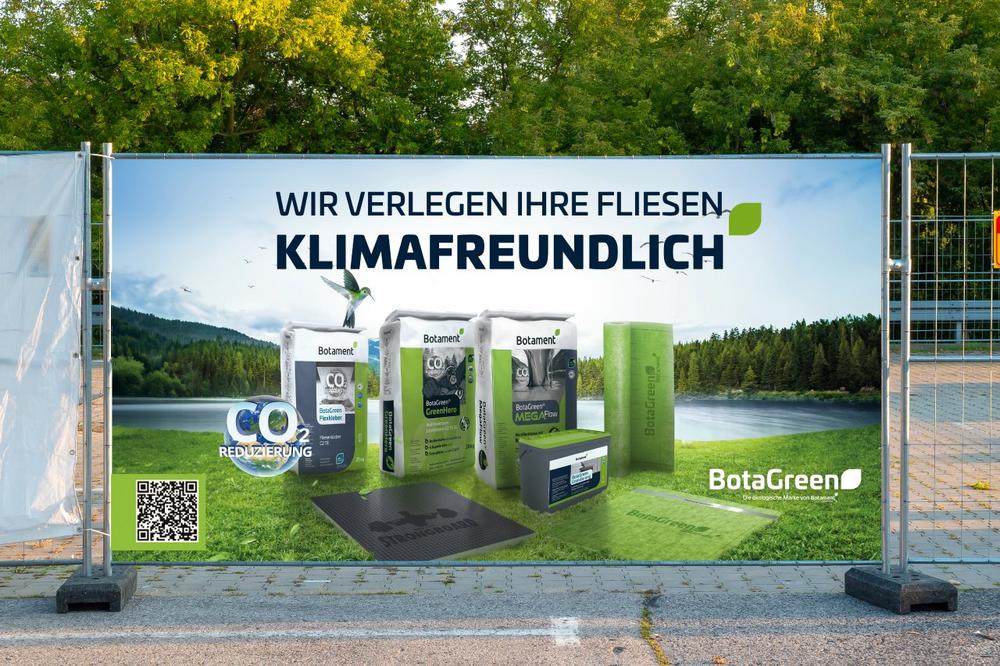 Die Kampagne bietet Botament-Kunden gleich zwei Werbepakete, bei denen die zentrale Aussage „Wir verlegen Ihre Fliesen klimafreundlich“ im Fokus steht: