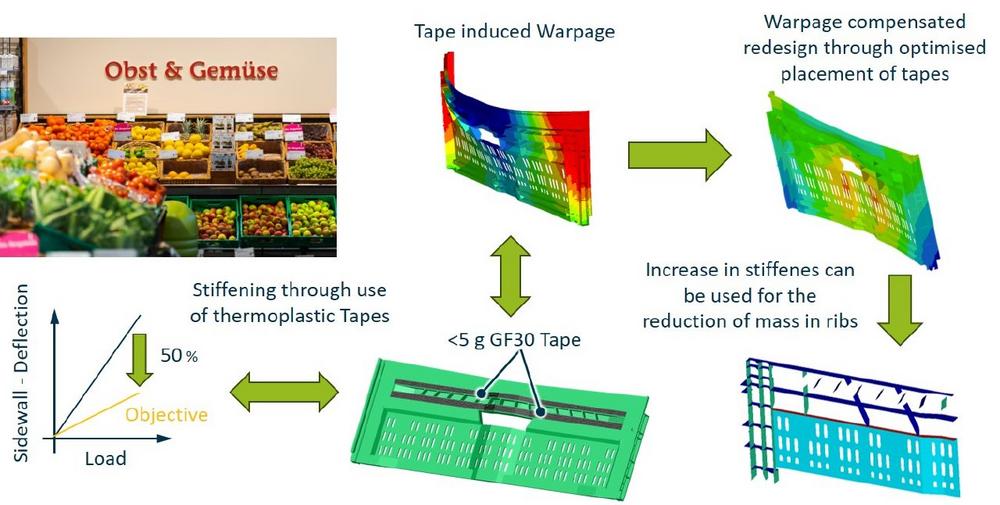 IKV’s optimisation algorithm was successfully used to redesign the side wall of a reusable folding box. These folding boxes are used worldwide in the logistics industry, and a total of over 20 million of them are in circulation. The aim of the redesign was to increase the flexural rigidity by 50 %, while minimising warpage at the same time. This target was reached for two different thermal load cases, and the warpage in both cases was within the manufacturer’s specifications. To achieve this target, 4 g of a PP-GF30 tape was sufficient, which represents around 1 % of the total weight of the component.