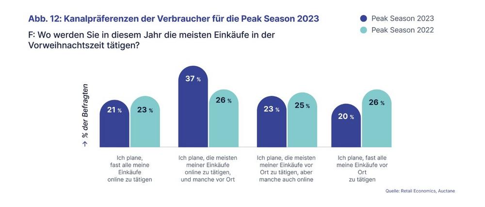 Das Internet ist nach wie vor der bevorzugte Verkaufskanal der Deutschen, und der Trend zum Einkaufen im stationären Handel scheint in diesem Jahr etwas abzunehmen: 58 Prozent der Verbraucher planen, in der Hauptsaison ihre Einkäufe überwiegend (37 Prozent) oder sogar ausschließlich (21 Prozent) online zu erledigen. Nur 20 Prozent kaufen ausschließlich in Geschäften ein, ein Rückgang von 6 Prozent gegenüber dem Vorjahr. Insgesamt entscheiden sich die meisten Verbraucher (60 Prozent) jedoch für einen gemischten Ansatz, bei dem sie sowohl in Geschäften als auch online einkaufen.