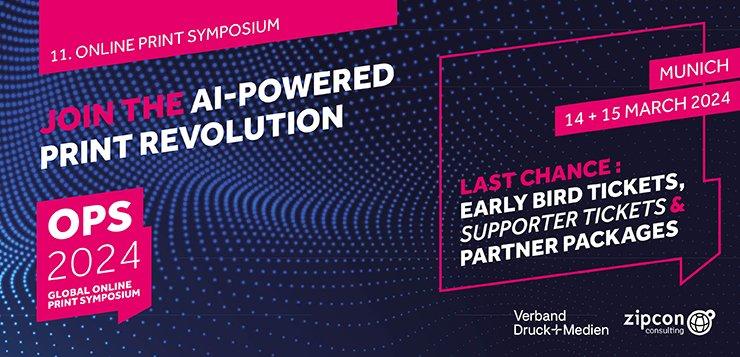 If you want to attend the Online Print Symposium on 14 and 15 March 2024 at the Science Congress Center Munich and benefit from the early bird conditions, you should be quick: The discounted tickets can only be booked until the end of December. This applies to both participant tickets and partner packages. The newly introduced supporter ticket category will no longer be available from January. All tickets are available here: https://online-print-symposium.de/en/registration/
