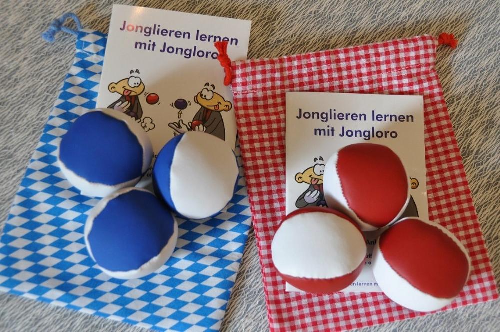 Drei weiß-blaue Bälle (Größe M, 90 gr) in einem weiß-blauen Stoffsäckchen oder drei rot-weiße Bälle (Größe M – 90 gr) in einem rot-weißen Säckchen. Auf Wunsch ist die 36-seitige Jonglier-Anleitung auch in bayerischer Sprache, kann aber auch in deutsch, englisch oder anderen Sprachen gewählt werden.