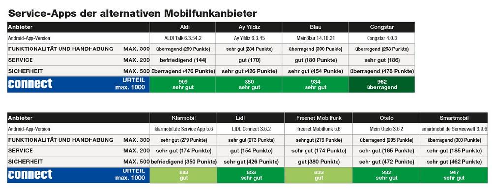 Congstar gelingt der souveräne Gesamtsieg mit der Note „überragend“ und 962 von 1.000 Punkten. Die App punktet mit hervorragender Menüstruktur und flüssiger Performanz, in puncto Sicherheit erhält sie nahezu perfekte Bewertungen in zwei Kategorien. Auf Platz zwei folgt Smartmobil und erhält mit 947 Punkten die Gesamtnote „sehr gut“. Die App wurde weiter optimiert und die Sicherheitsprüfungen zeigen, dass der Anbieter starke Verbesserungen in allen Bereichen vorgenommen hat. Blau erreicht Platz drei, die ServiceApp erhält 934 Punkte und damit ebenfalls die Note „sehr gut“ – insbesondere das moderne Design und die hohe Transparenz überzeugen, die Sicherheitsergebnisse sind sehr gut. Knapp dahinter auf Platz vier, ebenfalls „sehr gut“ mit 932 Punkten, liegt Mein Otelo. Die App ist unkompliziert und punktet mit herausragender Funktionalität, zudem erreicht sie den dritten Platz im Bereich Sicherheit. Den fünften Platz erreicht Aldi Talk mit 909 Punkten und dem Testurteil „sehr gut“. Besonders bemerkenswert: Aldi investierte merklich in die Sicherheit der App, so erreicht diese insgesamt den zweiten Platz in puncto Sicherheit und die Teilnote „überragend“. Auf den weiteren Plätzen folgen Ay Yildiz mit „sehr gut“ und 880 Punkten, Lidl mit „sehr gut“ und 853 Punkten sowie Freenet Mobilfunk mit 833 Punkten und Klarmobil mit 803 Punkten, beide erhalten die Note „gut“.