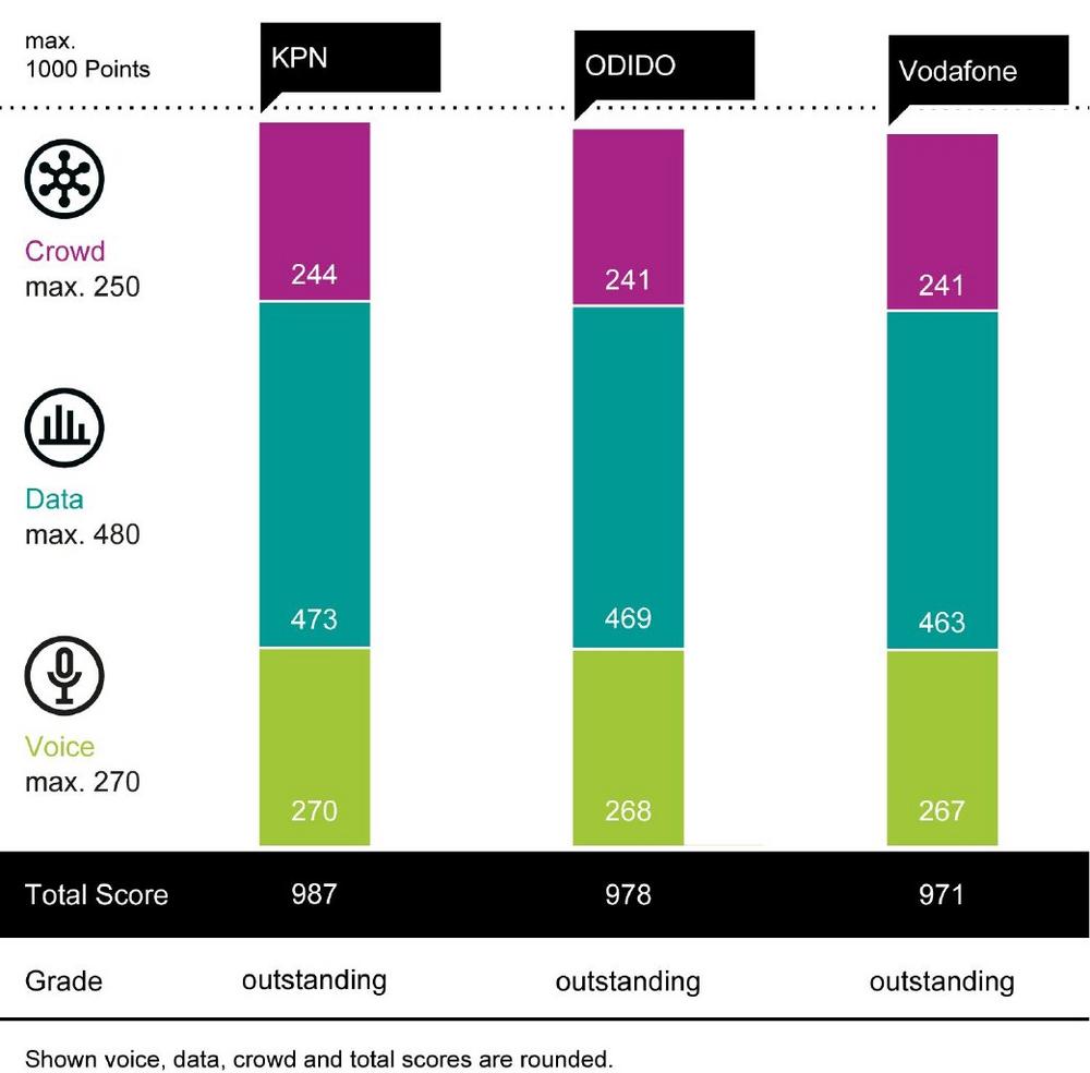 Vodafone is on a strong third place with 971 points, also achieving the overall grade “outstanding”. The operator manages to improve by eight points over its already strong result from the previous year. In the Crowdsourcing category, Vodafone is on par with second ranked Odido.