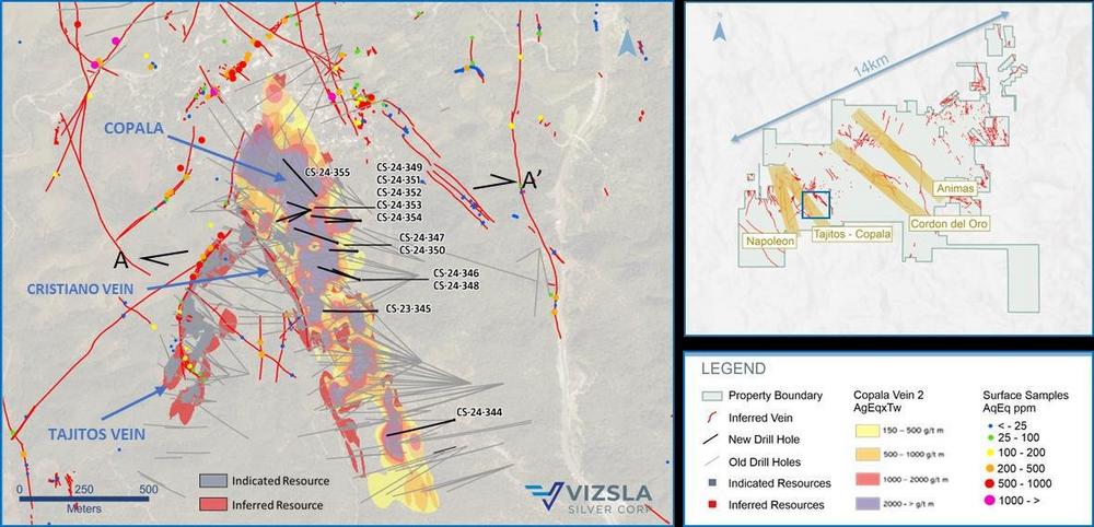 The precious metals dominant Copala Structure, located in the western portion of the Panuco district, is situated ~800 m to the east of the Napoleon vein. Copala currently hosts Indicated Resources of 83.3 Moz AgEq at 573 g/t AgEq and Inferred Resources of 48.3 Moz AgEq at 476 g/t AgEq within a broad envelope of vein-breccia interlayered with host rock, up to 82 metres thick (please refer to our Technical Report on Updated Mineral Resource Estimate for the Panuco Ag-Au-Pb-Zn Project, Sinaloa State, Mexico, by Allan Armitage, Ben Eggers and Peter Mehrfert, dated February 12, 2024 and to our Company´s press release dated January 8, 2024). Interpretations by Vizsla geologists indicate Copala has an average dip of ~46° to the east (~35° in its northern sector and steepening to ~65° in the southern sector).