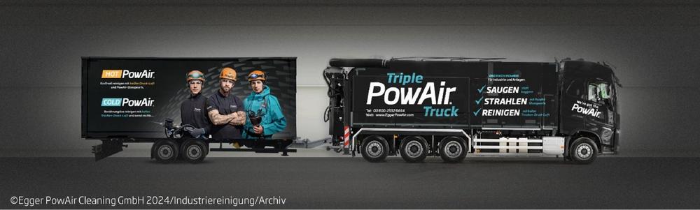 Industriereinigung 4.0 durch Patente, Verfahrensweisen, Materialforschung, Einsatz von TRIPLE POWAIR TRUCK – das ist Egger PowAir Cleaning – mobil in ganz Europa 24/7