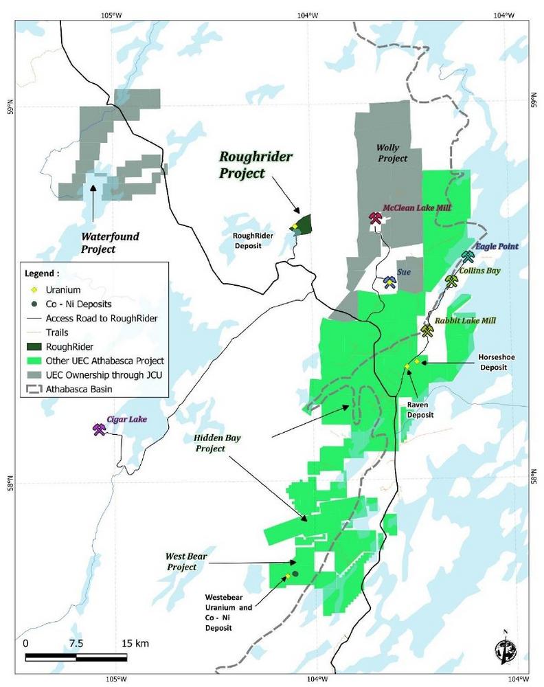 Das Projekt Roughrider ist ein Uranprojekt im östlichen Athabasca-Becken im Norden von Saskatchewan, Kanada, einem der wichtigsten Uranabbaugebiete der Welt. Das Projekt befindet sich etwa 13 Kilometer westlich der Mühle McClean Lake von Orano, in der Nähe der bestehenden Grundstücke von UEC im Athabasca-Becken. Die Tiefe der Mineralisierung auf dem Projekt beträgt etwa 200 m und befindet sich hauptsächlich im Grundgestein unterhalb der Diskordanz.