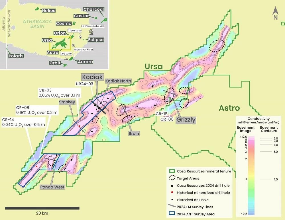 Keith Bodnarchuk, President and CEO, commented: “With drilling now underway, we are very excited by the strength of this program’s targets. Over the past 12 months the team has progressed Ursa from a high upside and severely underexplored project to one that has been strategically advanced by modern geophysics and is ready for more focused drill testing. Our efforts have produced 10 key target areas including the first follow-up drill targets at Kodiak and Grizzly. We have moved forward from reconnaissance-stage exploration to focusing in on areas displaying key components associated with uranium discoveries. Identifying multiple geologically derived drill targets early in Cosa’s exploration tenure at Ursa is a major testament to the hard work and dedication put forth by the technical team and to the prospectivity of the Ursa Project overall. We will have steady news flow for the remainder of 2024 and remain fully funded to complete our exploration plans into 2025.”
