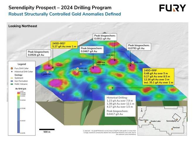 “The Eau Claire land package continues to deliver high-grade gold results through drilling. Fury’s systematic, disciplined exploration approach continues to build the overall potential of the project. In 2024 alone we have significantly increased the high-grade Eau Claire resource, published a maiden resource at Percival, and now a greenfields discovery at Serendipity. Needless to say, the team is excited to continue to develop and test targets throughout Fury’s land package,” stated Bryan Atkinson, SVP Exploration of Fury.