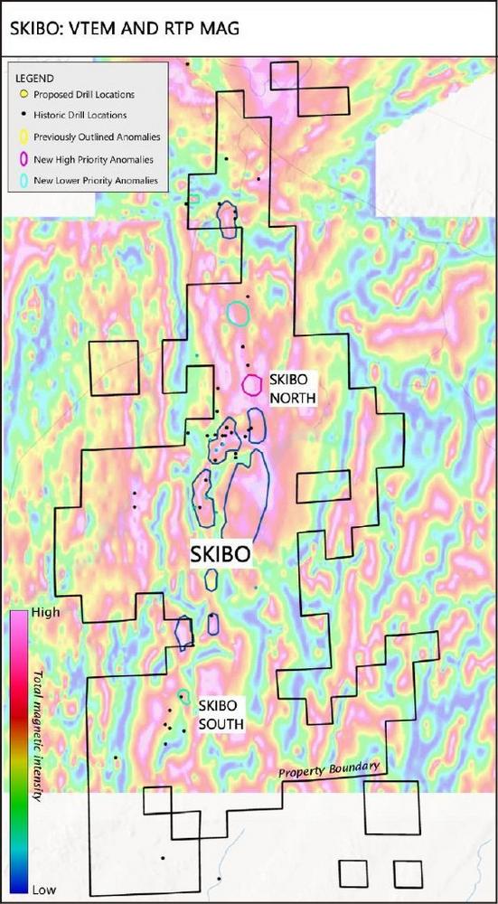 In der Vergangenheit wurden auf dem Prospektionsgebiet Skibo achtunddreißig Kernbohrlöcher niedergebracht; für neunzehn dieser Bohrungen liegen verifizierbare Analysedaten vor, und der Großteil des historischen Datenmaterials zeigt, dass der Bohrkern nur auf Kupfer (Cu), Nickel (Ni) ± Platingruppenmetalle (PGM) analysiert wurde. Die im Zusammenhang mit dem Titanprospektionsgebiet Titac südlich von Skibo beobachtete Geologie deutet darauf hin, dass die OUI, die in den historischen Bohrungen bei Skibo durchschnitten wurden, neben der bekannten Cu-Ni-PGM-Mineralisierung auch das Potenzial für die Auffindung einer Titan-Vanadium-Mineralisierung haben könnten; die Proben wurden jedoch nicht auf diese Elemente analysiert. Im Zuge einer kürzlichen Analyse historischer geophysikalischer Daten (siehe Pressemeldung vom 5. September 2024) grenzte das Unternehmen mehrere neue OUI-Ziele auf dem Prospektionsgebiet Skibo ab und verifizierte bereits bekannte OUI. Auf der Grundlage dieser und anderer Überprüfungen des für Skibo vorliegenden Datenmaterials wurden mehrere Bohrstandorte vorgeschlagen.