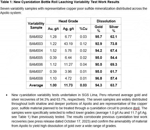 As a reminder, based on previous work completed, the Company envisions a conventional split circuit for processing material from Apollo with the copper rich stream (more than 0.15% copper) being treated through a flotation circuit and the copper poor stream (less than 0.15% copper) being treated through a precious metal focused cyanidation circuit to produce doré. The Company also now expects that a gravity circuit will be included after flotation for recovery of the high-grade tungsten mineralization.