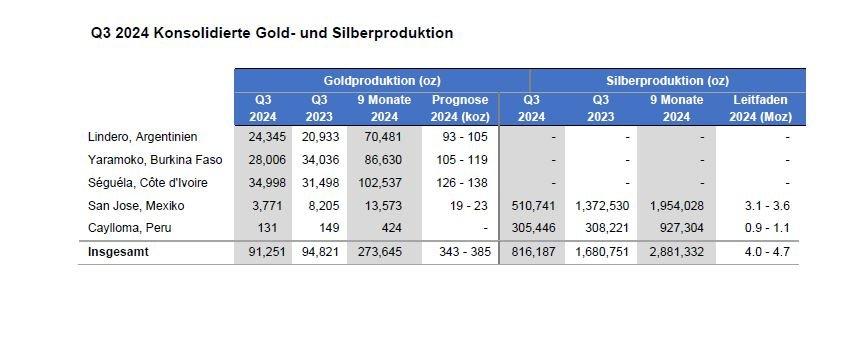 Q3 2024 Konsolidierte Gold- und Silberproduktion