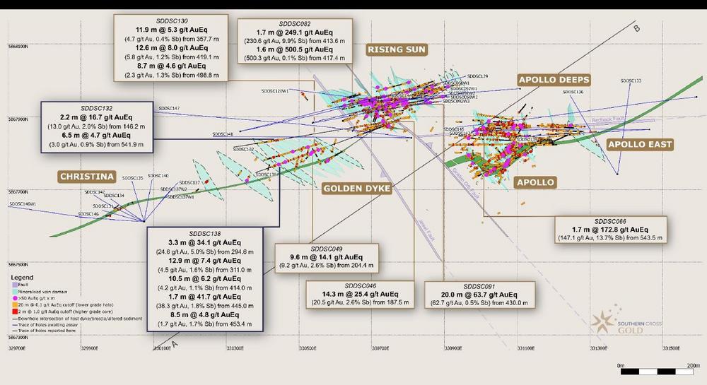 SDDSC138 wurde von Osten nach Westen gebohrt, parallel zu und innerhalb der Deich-/Brekzien-Hauptstruktur (die Leiter-"Schienen"), und durchschnitt zwölf mineralisierte Adersätze (die Leiter-"Sprossen") quer durch Rising Sun und Golden Dyke, während ein aussichtsreicher Korridor von 292 m (kumulative Bohrlochlänge des Deichs und des serizit-/karbonatveränderten Sediments) getestet wurde. SDDSC138 enthielt 15 Abschnitte mit Au > 20 g/t (bis zu 183 g/t Au) und 19 Abschnitte mit Sb > 5% (bis zu 33,8% Sb). Dieses Bohrloch wurde bis zu 250 m unterhalb der Oberfläche und 55 m bis 85 m oberhalb und parallel zu SDDSC130 (Bericht vom 05. September 2024) gebohrt, das eine Kontinuität der mineralisierten Strukturen, einige davon relativ nahe an der Oberfläche, ergab: