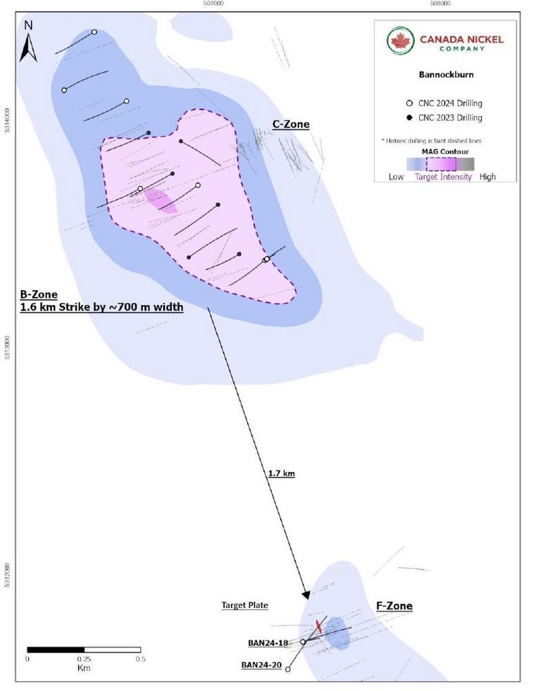Das Grundstück Bannockburn befindet sich 65 Kilometer südlich von Timmins und etwa 20 Kilometer westlich von Matachewan (Ontario). Das Unternehmen schloss vor kurzem Infill-Bohrungen in der niedriggradigen Nickelzone mit großen Tonnagen (B-Zone) ab und identifizierte neue aussichtsreiche Ziele, die auf höhergradiges Material getestet werden sollen. In der Vergangenheit wurden bei Bannockburn, der C-Zone und der F-Zone (Abbildung 1) höhergradige Abschnitte gebohrt. Die erste Ressource der Zone B wird voraussichtlich bis zum 1. Quartal 2025 abgeschlossen sein.