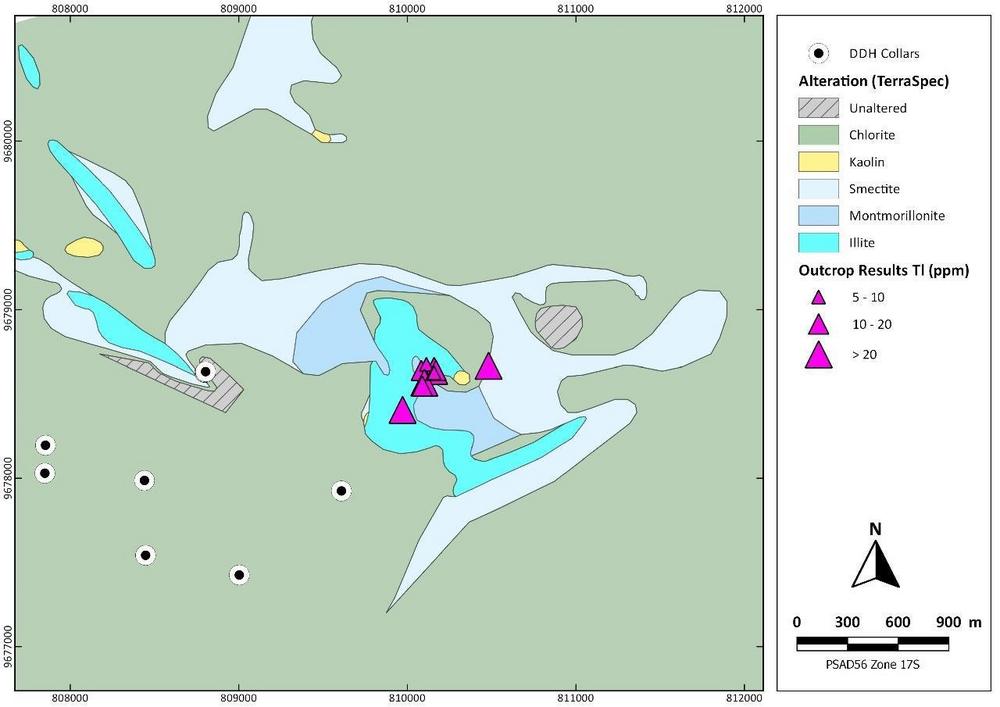 Kuri-Yawi ist das am weitesten fortgeschrittene epithermale Ziel auf dem Cutucu-Projekt des Unternehmens. Die Entdeckung zahlreicher Sinter durch das Aurania-Team im Jahr 2018 machte deutlich, dass das Gebiet sehr vielversprechend für eine epithermale Goldmineralisierung ist. Umfangreiche Feldarbeiten, die in der Folge in dem Gebiet durchgeführt wurden, einschließlich geologischer und bodengeochemischer Untersuchungen sowie einer Mobile MagnetoTellurics (MobileMT)-Luftbilduntersuchung, führten zur Bohrung von neun Erkundungslöchern in den Jahren 2020 und 2021, um die Bodenanomalien in der Tiefe zu untersuchen. Die Ergebnisse des Programms wiesen auf einen Mineralisierungsvektor in Richtung Nordosten hin, dem Gebiet, das Gegenstand der aktuellen IP-Untersuchung ist. Anschließende Schürfungen in diesem Gebiet entdeckten thalliumhaltige Chalcedon-Adern (siehe Abbildung 1). Wichtig ist, dass Thallium ein flüchtiges Element ist, das häufig in den oberen Teilen von epithermalen Lagerstätten vorkommt. Außerdem zeigen TerraSpec-Infrarotanalysen der Alterationsminerale in diesem Gebiet eine typische epithermale Chlorit-Smektit-Illit-Zonierung in Richtung der Aderzone. Das Vorhandensein dieser Minerale deutet auf eine intensive hydrothermale Alteration im Zentrum eines epithermalen Systems hin, die für die Entmagnetisierung des Gesteins in diesem Gebiet verantwortlich sein könnte und auch auf der magnetischen Luftvermessung von 2017 zu sehen ist (siehe Abbildung 2).