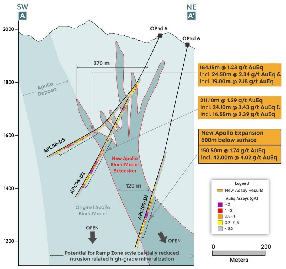 Ari Sussman, Executive Chairman commented: “Apollo continues to expand and deliver excellent results. Drill hole APC100-D1 confirms that the small surface outcrops and shallowly drilled fingers of poorly mineralized breccia at surface can transition into broad and high-grade mineralized zones at depth. Looking forward, our initial follow up hole to the Ramp Zone discovery (APC103-D1 from Pad 16) has recently entered the projection of the zone to the east of discovery hole APC99-D5 (57 metres @ 8.18 g/t AuEq; see press release dated October 22, 2024). Also, drilling from Pad 17 (APC104-D1 and APC104-D2) to orthogonally test for potential high-grade subzones within Apollo has cut wide zones of strong visible sulphide mineralization. Assay results for these holes are expected over the next two to six weeks.”