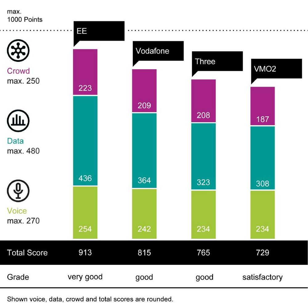 EE could defend its first place from the last network test and is “Best in Test” with 913 out of 1,000 points possible and the overall grade “very good”. The operator ranks first in all modules and shows the biggest score improvement over its previous year‘s results with a plus of 31 points. Vodafone ranks second with a score of 815 points and the overall grade “good”. The operator scores on par with EE in the voice assessment determined in the walk tests in cities and also achieves good results in the overall voice and data disciplines tested in the larger cities. Three is on third place, with 765 points and the overall grade “good”. Three achieves the second highest scores in the voice category on roads and railways. VMO2 comes in fourth, with an improvement of 29 points over its previous year’s score, achieving 729 points and the grade “satisfactory”. In the voice category, VMO2 scores on par with Three.